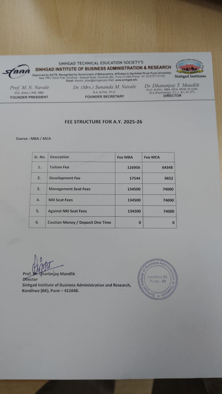 SIBAR provides two-year full-time postgraduate programs in Master of Business Administration (MBA) and Master of Computer Application (MCA). The annual fees for each program are approved by the Fees Regulating Authority (FRA) of the Government of Maharashtra.